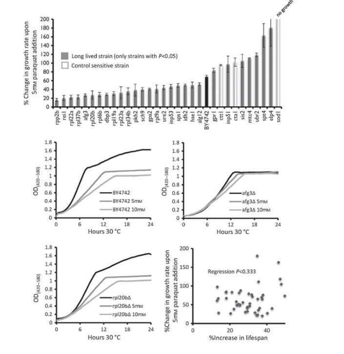 圖2、長壽菌株對Paraquat的生長抑制(A)顯示與野生型BY4742相比,長壽菌株在相對生長抑制上有顯著變化(P<0.05)。對照敏感株ctt1Δ、cta1Δ、sod1Δ用于比較。誤差棒為SEM。(B–D)野生型、rpl20bΔ和afg3Δ菌株在0、5或10 mM Paraquat下的代表性生長曲線。(E)散點圖比較每個長壽突變株的復(fù)制壽命百分比變化與生長速率百分比變化。