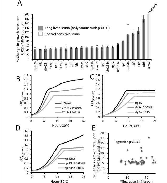 圖3.響應(yīng)MMS的長壽菌株的生長抑制。(a)顯示了與野生型BY4742相比,相對生長抑制顯著變化(p<0.05)的長壽菌株。顯示了對照敏感的rad52Δ應(yīng)變以供比較。誤差線是s.e.m。(b-d)野生型、rpl20bΔ和afg3Δ菌株在0、0.005%或0.01%MMS中的代表性生長曲線。(c)比較每個長壽突變體的復(fù)制壽命百分比變化與生長速率百分比變化的散點圖。
