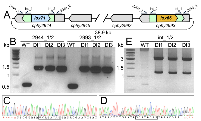 圖3、Cre介導(dǎo)的基因組缺失。(A)PCR檢測cphy2944(引物2944_1/2)、cphy2993(引物2993_1/2)及38.9 kb區(qū)域(引物2944_1/2993_2),比較pQcre1轉(zhuǎn)化前(DI-SS、DI-AS)與轉(zhuǎn)化后(Del-SS、Del-AS)。(B-C)Del-AS中內(nèi)含子片段(B)和Del-SS中l(wèi)ox72位點(diǎn)(C)的DNA測序色譜圖,紅色標(biāo)出回文位置或中央間隔。(D-E)Cre介導(dǎo)lox71與lox66之間基因組缺失模型:Del-AS株為雙向內(nèi)含子重組成28-bp內(nèi)含子片段(無lox72),Del-SS株為單向內(nèi)含子(含lox72)。