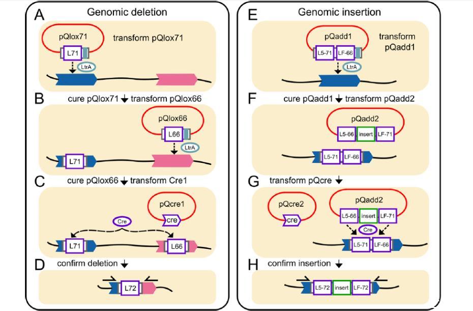 圖1、C.phytofermentans基因組缺失與插入概覽.(A)pQlox71引入,通過targetron編碼的LtrA蛋白在基因組中插入lox71(L71)位點(diǎn)。(B)pQlox71清除后,引入pQlox66,在基因組中插入lox66(L66)位點(diǎn)。(C)pQlox66清除后,引入pQcre1,Cre介導(dǎo)重組刪除lox66與lox71位點(diǎn)間的序列。(D)通過PCR確認(rèn)缺失和lox72位點(diǎn)(箭頭表示引物位置)。(E)引入pQadd1,將lox511/71(L5-71)和loxFAS/66(LF-66)盒送入基因組。(F)pQadd1清除后,引入pQadd2,攜帶目標(biāo)插入序列,位于lox511/66(L5-66)和loxFAS/71(LF-71)位點(diǎn)之間。(G)引入pQcre2,實(shí)現(xiàn)Cre介導(dǎo)的RMCE。(H)得到的株基因組中插入序列被lox511/72(L5-72)和loxFAS/72(LF-72)夾持,通過PCR確認(rèn)(箭頭表示引物)。