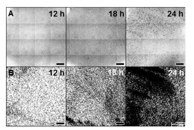 每個(gè)單獨(dú)圖像是拼接圖像集,顯示一個(gè)孔的中心表面——是由Cellavista評(píng)估的25張圖像的編譯。在研究天然化合物中,殼聚糖和黃芩素在低濃度下影響粘附或預(yù)形成生物膜,但地衣酸即使在300μg ml?1濃度下也未表現(xiàn)出足夠的抗生物膜特性,因此被排除其他測試(單因素方差分析:近平滑念珠菌粘附抑制P=0.67,生物膜發(fā)展P=0.014,預(yù)形成生物膜P=0.15)。生物膜排列在所有對照實(shí)驗(yàn)中兩種研究微生物中均勻。在大多數(shù)情況下,物質(zhì)影響并均勻降低覆蓋區(qū)域,除黃芩素外,其存在導(dǎo)致簇形成(白圈高亮),即使總覆蓋區(qū)域降低,特別是在近平滑念珠菌生物膜發(fā)展實(shí)驗(yàn)中(行B,第二列)。