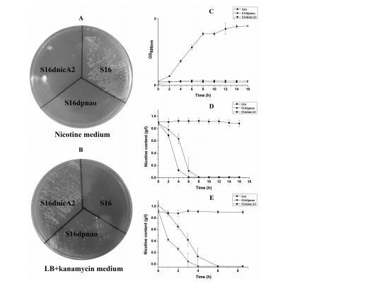 然而,缺失突變體S16dpnao在含有1 g l-1尼古丁的LB培養(yǎng)基中可以很好地降解尼古丁,其速率與野生型菌株S16相當(dāng)(圖7D)。與S16菌株相反,nicA2基因缺失突變體的靜息細(xì)胞不能降解尼古?。▓D7E)。pnao基因缺失突變體可以在含有1 gl-1尼古丁的LB培養(yǎng)基中生長(zhǎng)并將其顏色變?yōu)樯铧S色,而nicA2缺失突變體的培養(yǎng)基顏色沒有變化。此外,pnao基因缺失突變體的靜息細(xì)胞降解尼古丁,但它不能進(jìn)一步降解N-甲基米斯明,并且不能利用尼古丁作為唯一碳源和氮源(圖7A、7C和7E)。上述事實(shí)表明酶NicA2和Pnao對(duì)于該菌株的尼古丁降解至關(guān)重要。