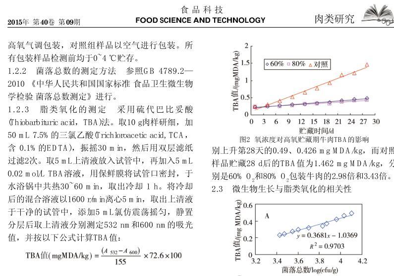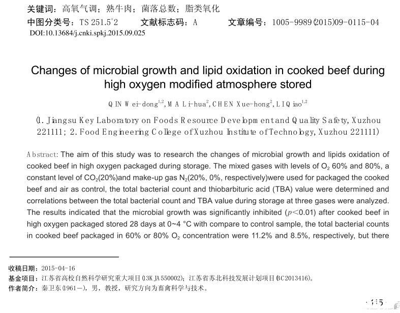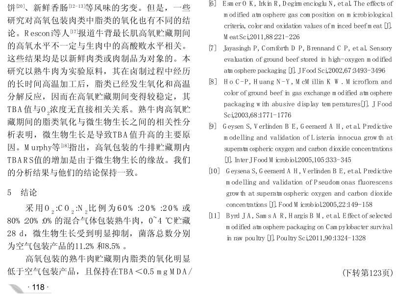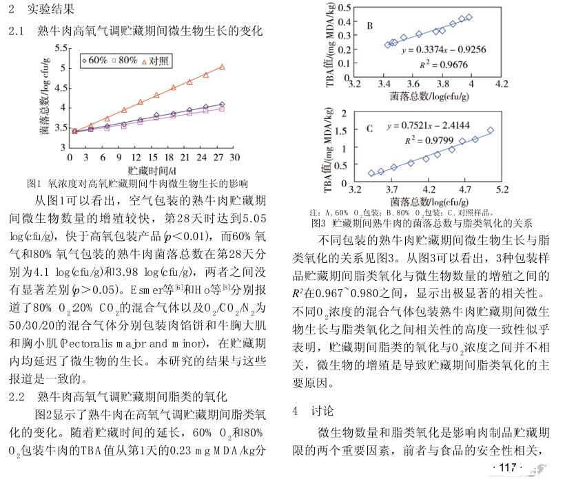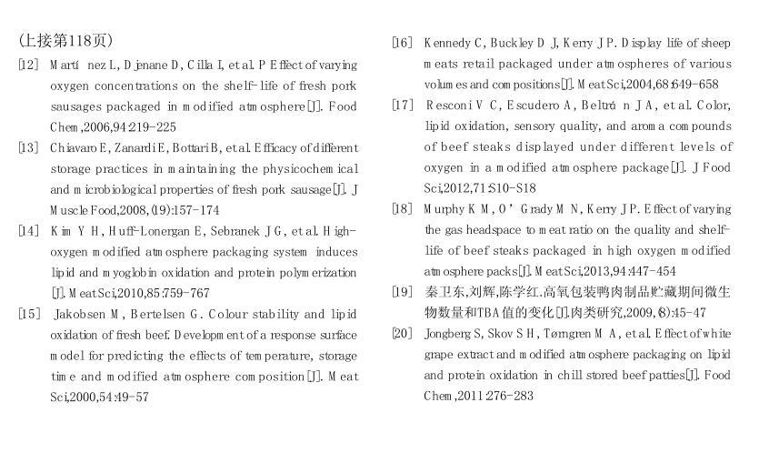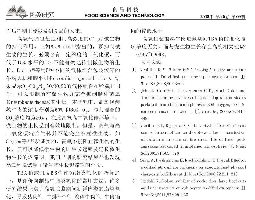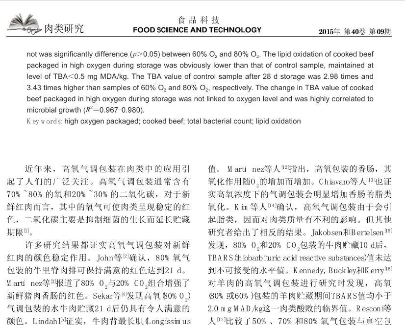 【摘要】:研究高氧氣調(diào)包裝的熟牛肉在貯藏期間微生物生長和脂類氧化的變化。選擇O2:CO2:N2比例為60%:20%:20%和80%:20%:0%的混合氣體包裝熟牛肉,以空氣包裝為對照,測定貯藏期間菌落總數(shù)和TBA值的變化,并分析了微生物生長和脂類氧化之間的相關(guān)性。結(jié)果表明:采用高氧混合氣體包裝的熟牛肉在0~4℃下貯藏28 d,與對照相比,微生物生長受到明顯抑制(p0.01),60%和80%氧氣包裝的熟牛肉中菌落總數(shù)分別為對照的11.2%和8.5%,2種混合氣體包裝樣品間沒有顯著差異(p0.05)。高氧包裝的熟牛肉貯藏期內(nèi)脂類的氧化明顯低于對照樣品,且保持在TBA0.5 mg MDA/kg的較低水平。對照樣品貯藏28 d后的TBA值分別是60%O2和80%O2包裝牛肉的2.98倍和3.43倍。高氧包裝的熟牛肉貯藏期間TBA值的變化與O2濃度無關(guān),而與微生物生長存在高度相關(guān)性(R2=0.967~0.980)。