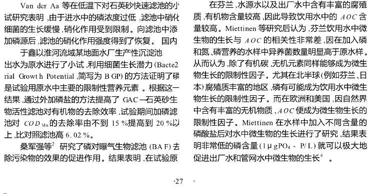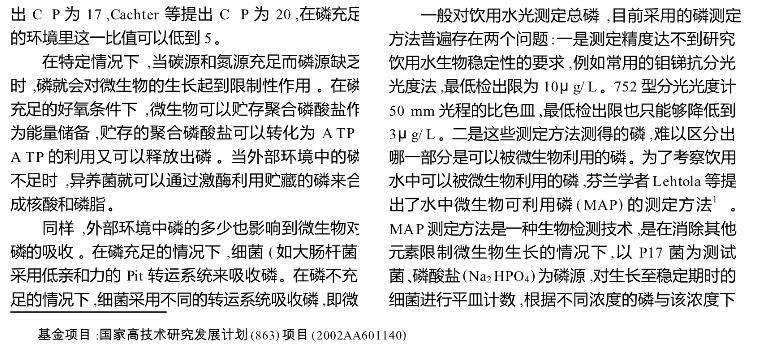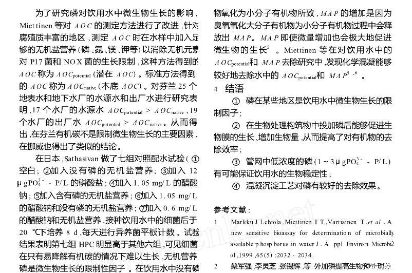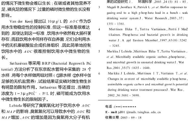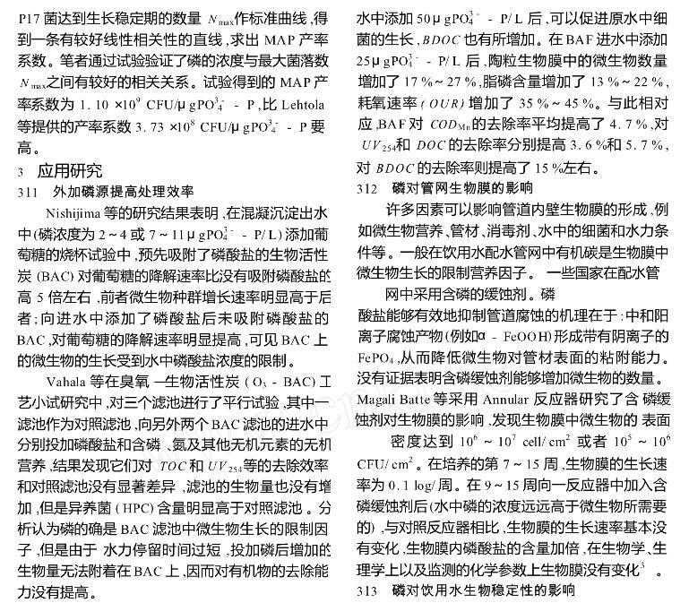 【摘要】:闡述了磷在微生物生長(zhǎng)中的重要作用以及磷限制微生物生長(zhǎng)的作用機(jī)理,介紹了飲用水中可以被微生物利用的磷源。著重從三個(gè)方面討論了磷對(duì)微生物生長(zhǎng)限制作用的最新研究進(jìn)展:外加磷源提高水處理構(gòu)筑物的處理效率;磷對(duì)管網(wǎng)生物膜的影響;磷對(duì)飲用水生物穩(wěn)定性的影響。