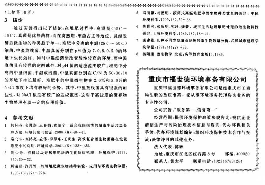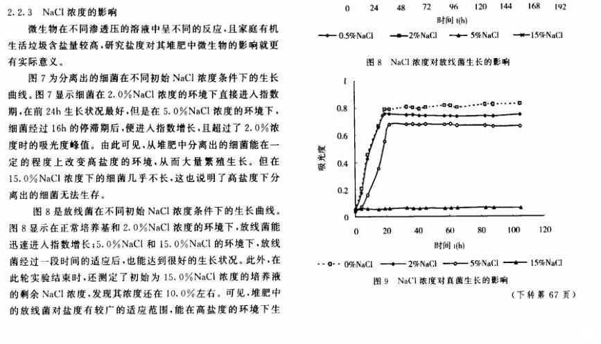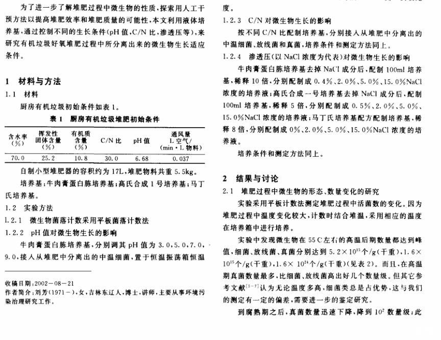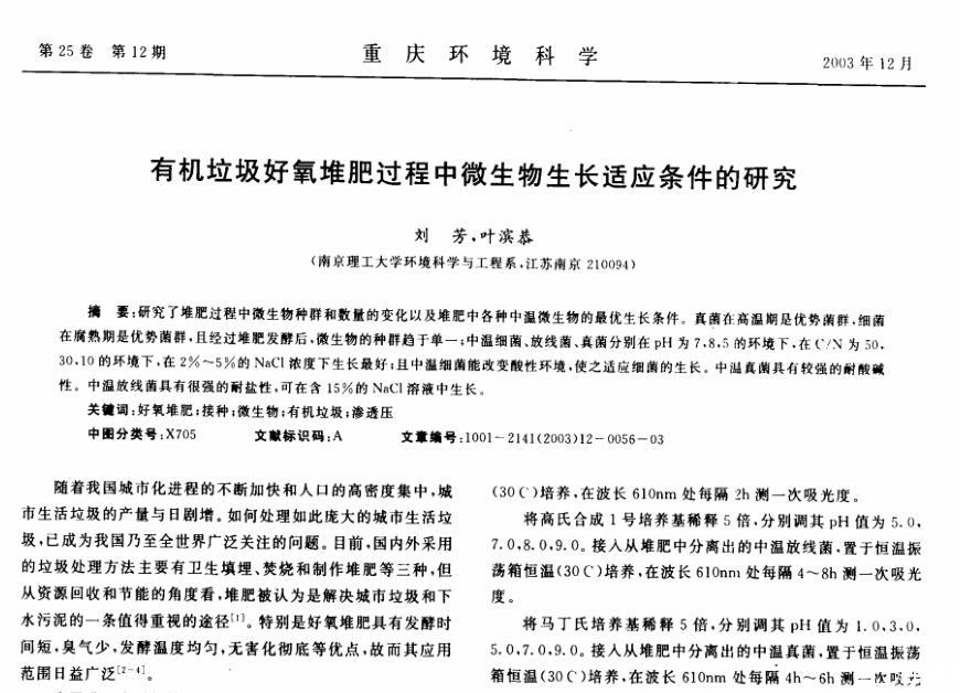 【摘要】:研究了堆肥過(guò)程中微生物種群和數(shù)量的變化以及堆肥中各種中溫微生物的最優(yōu)生長(zhǎng)條件。真菌在高溫期是優(yōu)勢(shì)菌群,細(xì)菌在腐熟期是優(yōu)勢(shì)菌群,且經(jīng)過(guò)堆肥發(fā)酵后,微生物的種群趨于單一;中溫細(xì)菌、放線菌、真菌分別在p H為7,8,5的環(huán)境下,在C/N為50,30,1 0的環(huán)境下,在2%~5%的Na Cl濃度下生長(zhǎng)最好;且中溫細(xì)菌能改變酸性環(huán)境,使之適應(yīng)細(xì)菌的生長(zhǎng)。中溫真菌具有較強(qiáng)的耐酸堿性。中溫放線菌具有很強(qiáng)的耐鹽性,可在含1 5%的Na Cl溶液中生長(zhǎng)。