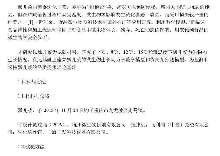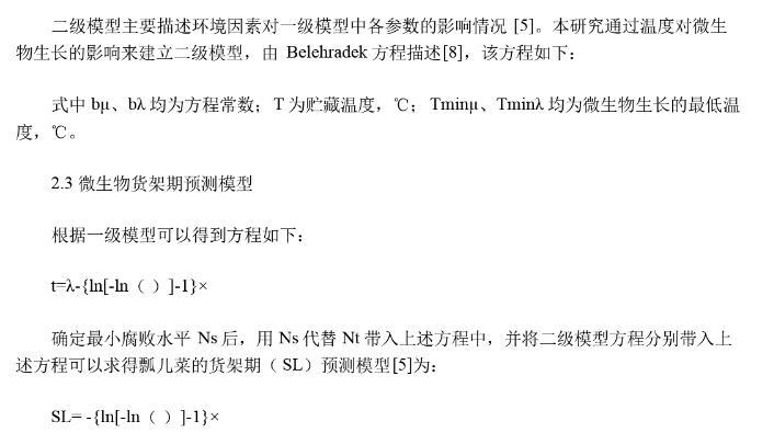 【摘要】:以采后瓢兒菜為試驗(yàn)對(duì)象,研究了不同貯藏溫度下瓢兒菜的微生物生長(zhǎng)趨勢(shì),建立了瓢兒菜微生物生長(zhǎng)動(dòng)力學(xué)模型和微生物貨架期預(yù)測(cè)模型。結(jié)果表明:修正的Gompertz方程能夠較好地?cái)M合不同溫度下瓢兒菜微生物生長(zhǎng)的初級(jí)模型,其R~2均大于0.90;瓢兒菜的最大菌數(shù)Nmax隨溫度的變化波動(dòng)不大,平均值為(6.85±0.1265)cfu/g;最大比生長(zhǎng)速率μmax隨溫度的上升而增加,生長(zhǎng)延滯時(shí)間λ隨溫度的上升而減??;二級(jí)模型為=0.040×[T-(-0.198)]及=0.260×[T-(-3.379)],其R2均大于0.90。通過(guò)初級(jí)模型和二級(jí)模型確立了瓢兒菜的微生物貨架期預(yù)測(cè)模型。