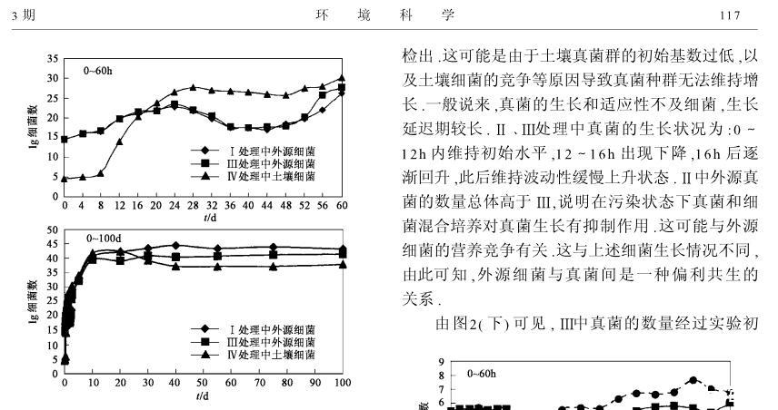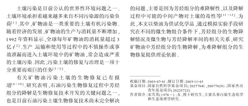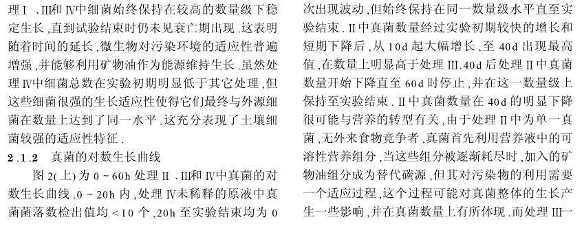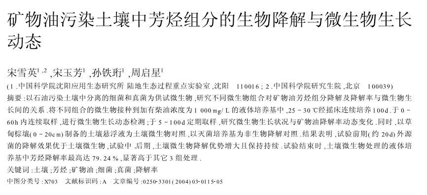 同時(shí),以草甸棕壤(0~2 0cm)制備的土壤懸浮液為土壤微生物對照,以滅菌培養(yǎng)基為非生物降解對照。結(jié)果表明,試驗(yàn)前期(約2 0d)外源菌的降解效果優(yōu)于土壤微生物,試驗(yàn)中、后期,土壤微生物降解優(yōu)勢增大且保持持續(xù)。試驗(yàn)結(jié)束時(shí),土壤微生物處理的液體培養(yǎng)基中芳烴降解率最高達(dá)79 2 4%,顯著高于其它3組處理。