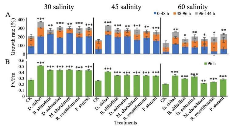 從分離的細(xì)菌中隨機(jī)選取6株MGPBs,與無(wú)菌小球藻AHN11在高鹽培養(yǎng)基中進(jìn)行二元培養(yǎng)。隨著鹽度的增加,純培養(yǎng)物的生長(zhǎng)速率降低,而與細(xì)菌共培養(yǎng)時(shí)生長(zhǎng)速率提高(圖4)。除P.stutzeri外,與鹽度為30時(shí)相比,MGPB對(duì)微藻生長(zhǎng)的促進(jìn)作用在鹽度為45時(shí)增強(qiáng),在鹽度為60時(shí)減弱。當(dāng)微藻與P.stutzeri共培養(yǎng)時(shí),與鹽度為30時(shí)相比,鹽度為45時(shí)生長(zhǎng)促進(jìn)效應(yīng)減弱,鹽度為60時(shí)生長(zhǎng)促進(jìn)效應(yīng)增強(qiáng),這表明在較高鹽度下,P.stutzeri提高微藻耐鹽性的能力最強(qiáng)。P.stutzeri是一種常見(jiàn)的植物促生細(xì)菌(PGPB),廣泛應(yīng)用于改善植物在遞增鹽度梯度下的生長(zhǎng)。而在微藻中,影響其鹽度適應(yīng)的驅(qū)動(dòng)因素是微藻-細(xì)菌相互作用,即特定微生物的存在改變了微藻的鹽適應(yīng)性,這可能歸因于細(xì)菌分泌的耐鹽酶。在所有鹽度下,所有二元培養(yǎng)液的Fv/Fm均極顯著高于AHN11單培養(yǎng)液(P<;0.1)(圖4B),進(jìn)一步證明了MGPB能夠緩解小球藻的鹽脅迫。