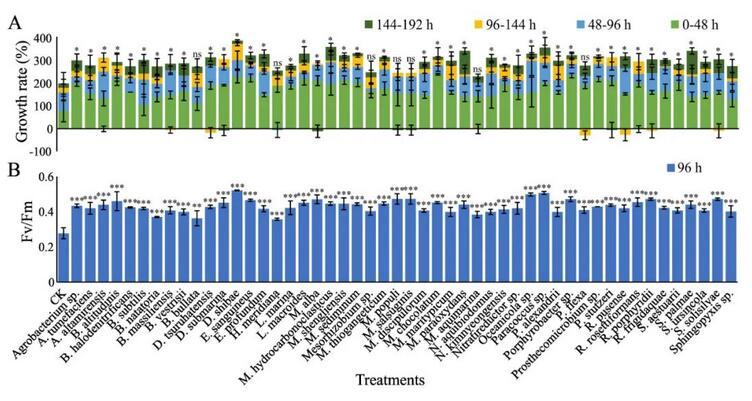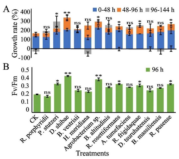 圖2.AHN11與共生細(xì)菌的二元培養(yǎng)。(A)通過(guò)細(xì)胞密度變化計(jì)算的相對(duì)生長(zhǎng)率。(B)96小時(shí)微藻Fv/Fm。橫坐標(biāo)表示添加菌株;CK是無(wú)菌微藻培養(yǎng)物。處理組和對(duì)照組在第192小時(shí)的生長(zhǎng)速率差異:無(wú)差異(ns),P<;0.05(*),P<;0.01(**)。