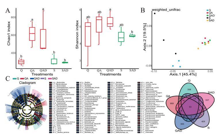 圖6.細(xì)菌組成差異。(A)α-多樣性。(B)β-多樣性。(C)海洋樣本中的共有物種和特有物種。S&Q:S-或Q-海水中的細(xì)菌組成。QA:寧波3號(hào)Q-海水中培養(yǎng)的藻際細(xì)菌組成。SAD&QAD:在添加有D.shibae的寧波3號(hào)S-或Q-海水中培養(yǎng)的藻際細(xì)菌組成。