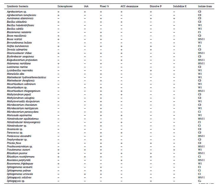在上述所有條件下,D.shibea對(duì)微藻的生長(zhǎng)促進(jìn)作用最好。D.shibea是玫瑰桿菌分支的一員,最初從鞭毛藻中分離出來(lái),并已被證明是一種普遍存在的海洋微藻共生體。研究發(fā)現(xiàn),D.shibea可以分泌多種外生代謝物,包括B族維生素前體和生長(zhǎng)因子,這可能有利于微藻的生長(zhǎng)。此外,代謝組學(xué)分析顯示,當(dāng)與D.shibea共培養(yǎng)時(shí),假微型海鏈藻(Thalassiosira pseudonana)細(xì)胞中的多種氨基酸、脂肪酸和C4糖的表達(dá)均有上調(diào)。本研究已經(jīng)證實(shí)D.shibea具有鐵載體、ACC脫氨酶活性和固氮作用,有助于微藻利用不溶性鐵、N2和降解ACC(乙烯的前體),從而促進(jìn)微藻生長(zhǎng)。56631669418228138