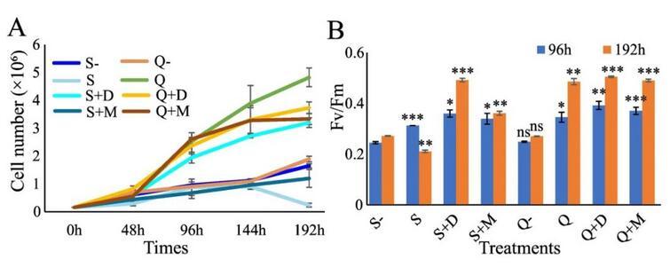 圖5.AHN11在S或Q海水培養(yǎng)基中的生長(zhǎng)。(A)微藻的生長(zhǎng)。(B)微藻的Fv/Fm。S-&Q-:高壓滅菌寧波3號(hào)S-或Q-海水。S&Q:寧波3號(hào)S-或Q-海水。S+D&Q+D:接種ANH11和D.shibae的寧波3號(hào)S-或Q-海水。S+M&Q+M:接種ANH11和混合細(xì)菌的寧波3號(hào)S-或Q-海水。與對(duì)照組相比,在實(shí)驗(yàn)結(jié)束時(shí)標(biāo)記差異:P<;0.5(*),P<;0.1(**),P<;0.01(**)。