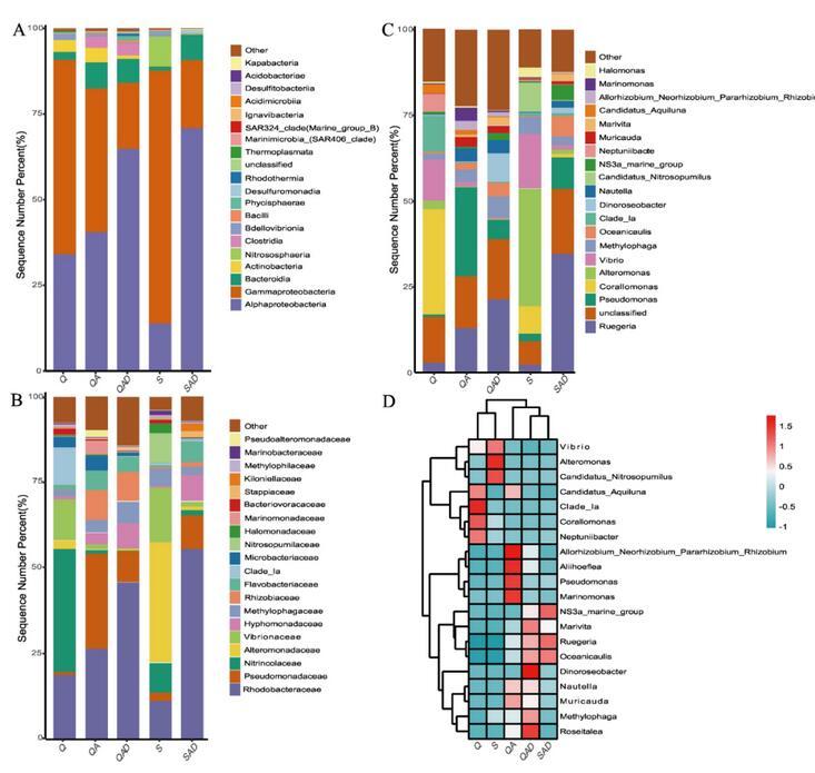 圖7.細(xì)菌組成。(A)綱水平上樣本OTU的分布。(B)科水平上樣本OTU的分布。(C)屬水平上樣本OTU的分布。(D)屬水平上樣本細(xì)菌群落組成。S&Q:S-或Q-海水中的細(xì)菌組成。QA:寧波3號(hào)Q-海水中培養(yǎng)的藻際細(xì)菌組成。SAD&QAD:在添加有D.shibae的寧波3號(hào)S-或Q-海水中培養(yǎng)的藻際細(xì)菌組成。
