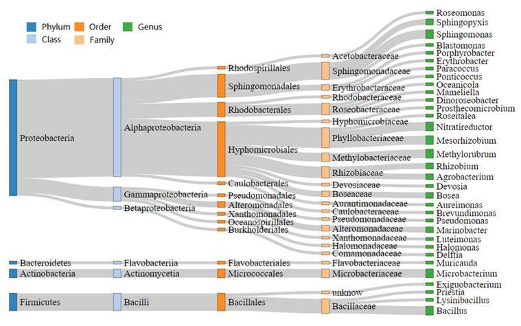 圖1.Sankey圖顯示了本研究中分離的50種海洋細(xì)菌基于其16S rDNA序列的關(guān)系。