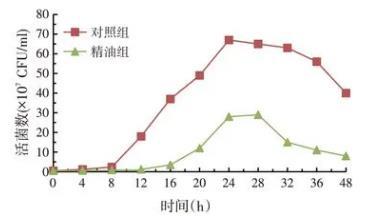 將供試菌種(嗜酸乳桿菌、梭狀芽孢桿菌、酵母菌、串珠鐮刀菌)培養(yǎng)至對數(shù)生長期,取出部分菌液,分為對照組和松針精油組,對照組將菌液直接用相應的液體培養(yǎng)基稀釋到菌體個數(shù)為105~106CFU/ml;精油組將菌液加到含精油濃度為最低抑菌濃度的液體培養(yǎng)基中,繼續(xù)培養(yǎng)。分別在0、4、8、12、16、20、24、28、32、36、48 h取樣測活菌數(shù),制作出對照組生長曲線和精油組生長曲線。