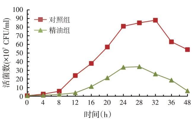由圖3可知,對照組串珠鐮刀菌在0~16 h處于生長遲緩期,16~36 h處于對數(shù)生長期,36~48 h處于穩(wěn)定期,最大活菌數(shù)為2.5×109CFU/ml。在加入松針精油后,串珠鐮刀菌生長遲緩期延長到24 h,對數(shù)生長期縮短到32 h,并且菌體數(shù)量的峰值較對照組菌體降低39.68%。由以上分析可看出,松針精油對串珠鐮刀菌的生長有著極為明顯的抑制效果,能較長時間的抑制串珠鐮刀菌的生長,縮短了對數(shù)生長期菌種的生長時間,大幅度降低最大活菌數(shù)。