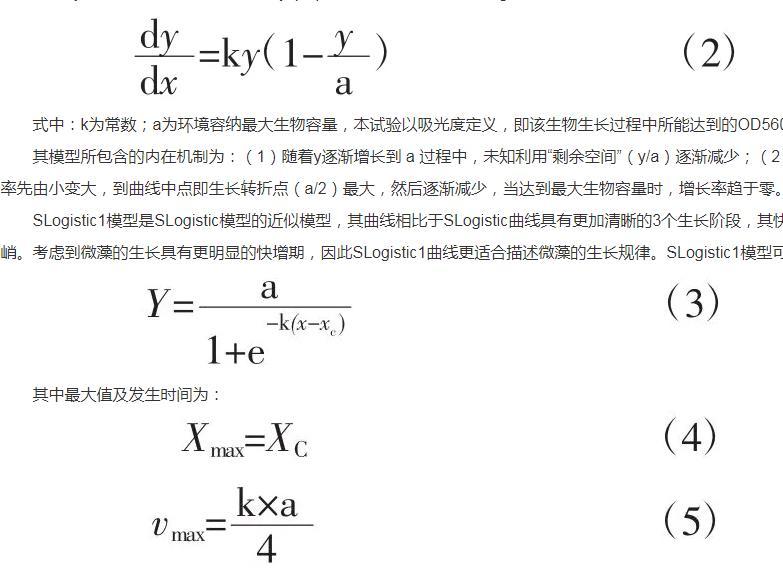 SLogistic模型所對應的假設條件是在有限的生物資源條件下單個微生物生長具有相同的增長率,且所需營養(yǎng)相同。把增長率dy/dx與任意時間的種群生物量y(x)聯(lián)系在一起,典型的SLogistic模型可以表示為: