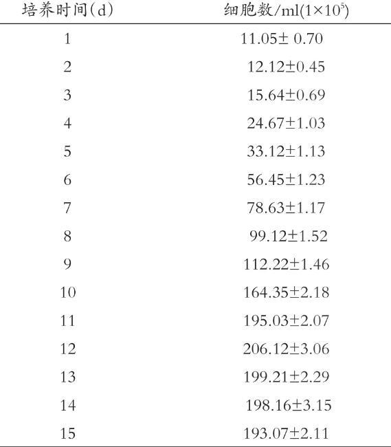 細胞接種當(dāng)天計為0d,在培養(yǎng)的1-15d間每天下午16點取3塊平皿的細胞用血球計數(shù)板進行細胞計數(shù)。