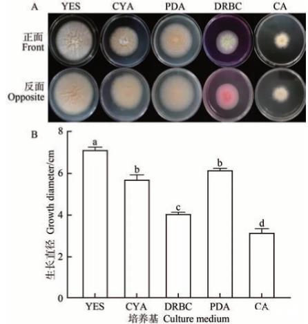 圖2 硫色曲霉在不同培養(yǎng)基上的生長直徑(A)和生長速率(B)
