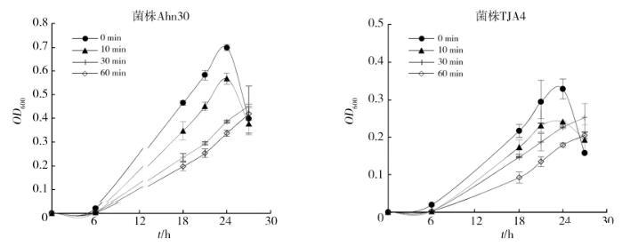 鏈霉菌Ahn30和TJA4經(jīng)紫外線照射后的生長(zhǎng)情況(酶標(biāo)儀分光光度法)