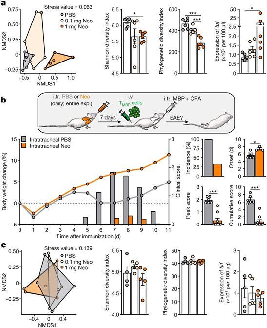 操縱肺部微生物群影響中樞神經(jīng)系統(tǒng)自身免疫,圖片來自Nature,2022,doi:10.1038/s41586-022-04427-4。