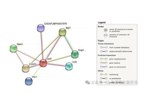 圖4、煙曲霉(NCBI分類ID:746128)中查詢蛋白Gel4(紅色節(jié)點)的蛋白質(zhì)相互作用網(wǎng)絡(luò),圖例減少。每個節(jié)點代表一種蛋白質(zhì)。填充節(jié)點具有已知或預(yù)測的3D結(jié)構(gòu),而空節(jié)點則沒有。邊緣代表蛋白質(zhì)-蛋白質(zhì)相互作用,顏色表示已知、預(yù)測或其他相互作用。