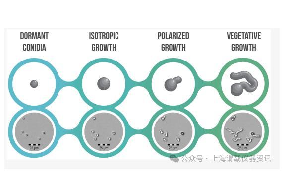 曲霉屬是一組多樣化的真菌,它們都經(jīng)歷無性生命周期并產(chǎn)生分生孢子。分生孢子可抵抗許多應(yīng)激源,例如溫度驟變、干旱、低營養(yǎng)有效性以及滲透壓和氧化應(yīng)激。應(yīng)用Biosense微生物動態(tài)監(jiān)測系統(tǒng)監(jiān)測煙曲霉的生長過程,獲得煙曲霉孢子生長過程中的四種形態(tài)。煙曲霉的休眠或休眠分生孢子構(gòu)成第一個萌發(fā)形態(tài)類型,它們是最小的,直徑約為2–3μm。第二種形態(tài)是休眠的破壞,它是不可見的,但以分生孢子的轉(zhuǎn)錄變化為特征。在第三種形態(tài)中,發(fā)生各向同性生長,分生孢子膨脹到原來大小的兩倍左右。第四種形態(tài)類型是從各向同性到極化生長的轉(zhuǎn)變。芽管也稱為極管。