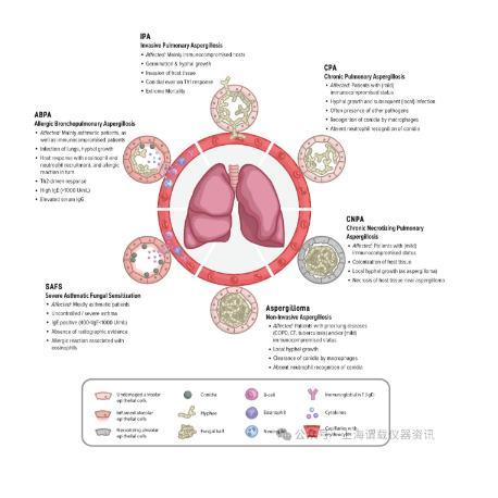 圖1、由曲霉引起的常見肺部疾病的示意圖。代表性肺泡、帶有紅細胞的毛細血管和免疫細胞參與了曲霉病的直接病理學,例如變應(yīng)性支氣管肺曲霉菌病(ABPA)和伴有真菌致敏的嚴重哮喘(SAFS)。