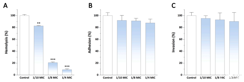 圖4、PLA對(A)溶血活性、(B)附著能力和(C)侵入Caco-2細(xì)胞的影響。