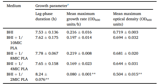 圖1、核細(xì)胞增生李斯特菌10403S在不同濃度PLA的BHI中的生長曲線。當(dāng)暴露于1/2MIC的PLA時,菌株生長受損,滯后期延長9.5%(P<0.05),最大生長速率降低62.8%。