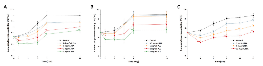 圖5、單核細(xì)胞增生李斯特菌10403S(A)在UHT全脂牛奶和(B)添加PLA的巴氏殺菌牛奶中的菌落計(jì)數(shù),以及(C)在浸涂PLA后在五香牛肉上的菌落計(jì)數(shù)。