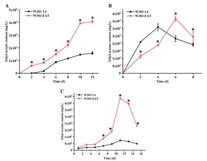 圖5、W303-1A和W303-EAT不同低酒精度葡萄酒[玫瑰酒(A)、藍莓酒(B)和黃酒(C)]中乙酸乙酯含量的比較。星號(*)表示不同低度酒中乙酸乙酯含量。從圖中可以看出重組菌株W303-EAT可以提高玫瑰酒、藍莓酒、黃酒等低發(fā)酵酒發(fā)酵過程中乙酸乙酯的含量,對增強香氣和增強酒香起到積極的作用,改善酒的風味。
