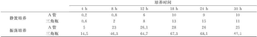 3.1靜置及振蕩培養(yǎng)結(jié)果見表1。從表1看出,靜置培養(yǎng),A管與三角瓶菌數(shù)變化趨勢一致,18~24 h可達到菌數(shù)穩(wěn)定期;振蕩培養(yǎng),A管與三角瓶菌數(shù)變化趨勢基本一致,8~12 h可達到菌數(shù)穩(wěn)定期。