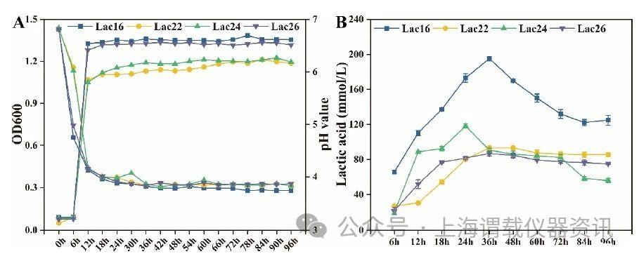 圖3、乳酸菌的生長(A)、pH(A)和乳酸產(chǎn)量(B)。如圖所示,這四種菌株發(fā)酵培養(yǎng)物的pH值在穩(wěn)定期約為3.8。這四種菌株的乳酸產(chǎn)量在對數(shù)生長期和早期穩(wěn)定期增加,而在晚期穩(wěn)定期減少。Lac16比其他三個菌株產(chǎn)生更高(p<0.05)的乳酸。