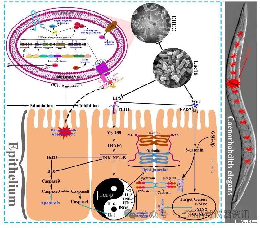 圖5、植物乳桿菌Lac16對腸出血性大腸桿菌O157:H7感染的保護(hù)作用的圖形總結(jié)。植物乳桿菌Lac16通過抑制大腸桿菌O157:H7的關(guān)鍵毒力特性和增強腸上皮屏障功能,減輕腸出血性大腸桿菌O157:H7感染誘導(dǎo)的對秀麗隱桿線蟲的毒性和LPS暴露誘導(dǎo)的腸上皮損傷,這可能是由激活的Wnt/β-catenin信號通路和抑制的TLR4-MyD88信號通路介導(dǎo)。