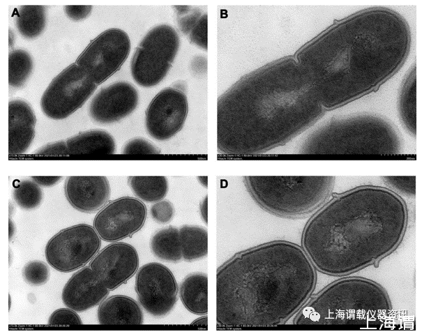 圖2、親本菌株和SM-Cs的形態(tài)。TEM圖顯示了來自變形鏈球菌593(A,×15k和B,×30k)和SM 593-C(C,×15k和D,×30k)的細(xì)胞形態(tài)。