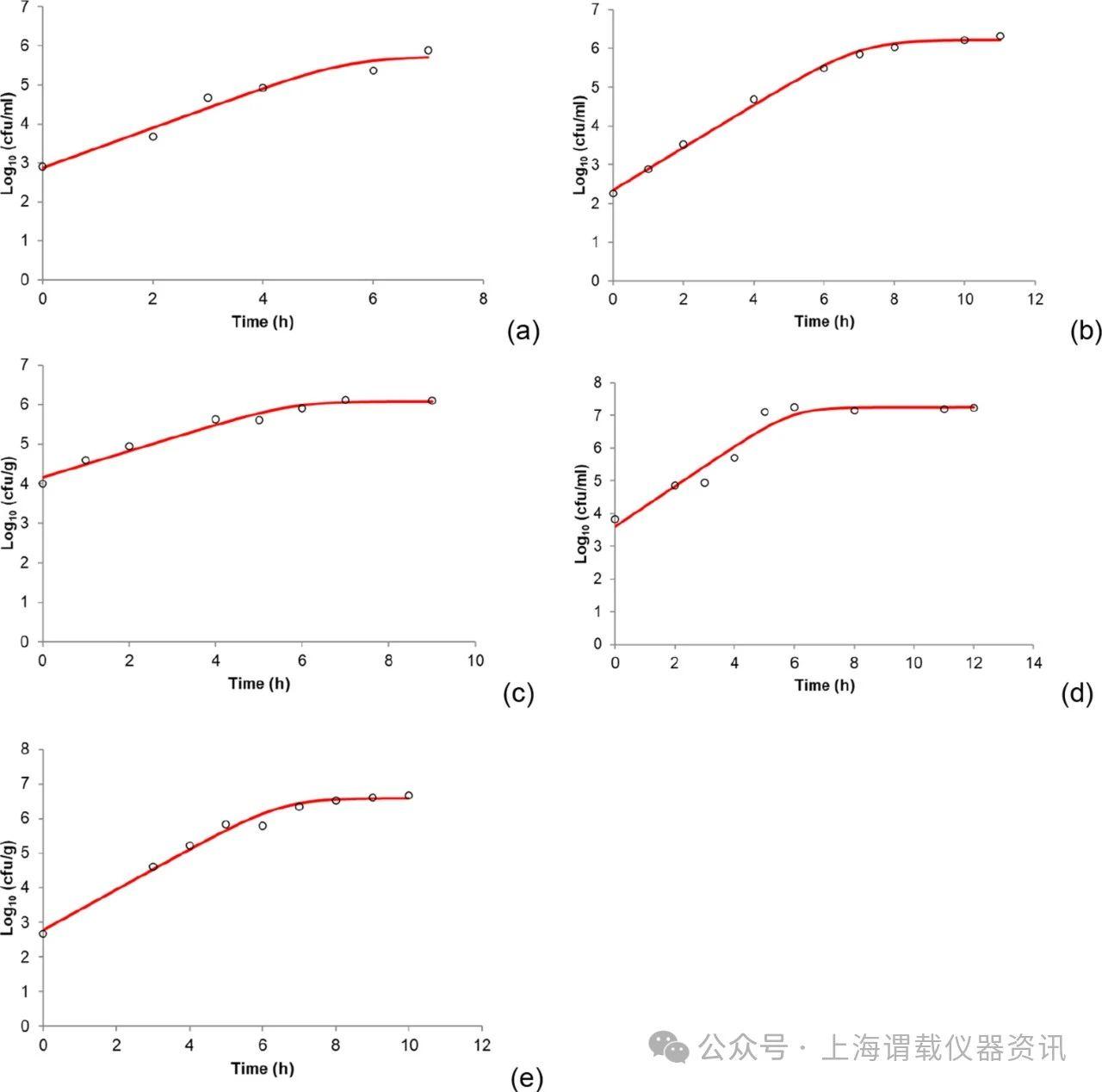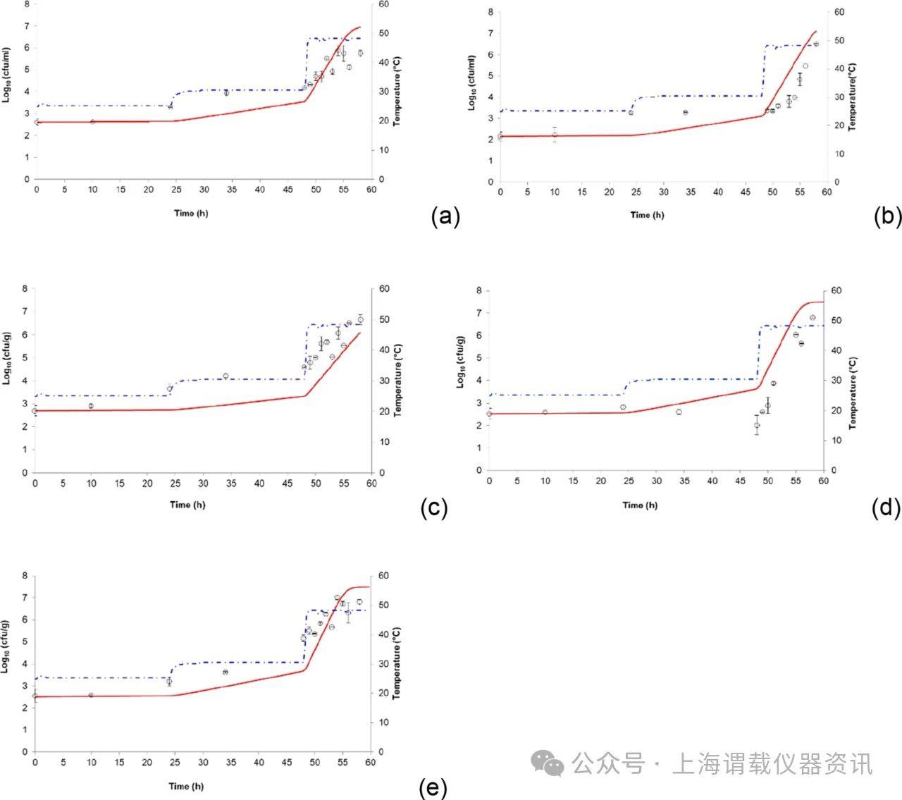 圖5、觀察到的比較(○)和預(yù)測(cè)增長(zhǎng)(-)的凝結(jié)芽孢桿菌DSM 1的凝結(jié)芽孢桿菌DSM 1在淡奶(a)、燕麥和杏仁飲料(b)、酸奶甜點(diǎn)(c)、蘑菇片罐頭(d)和牛肉和蔬菜泥(e)中,在非等溫條件下(25°C/24小時(shí)–30°C/24小時(shí)–50°C/10小時(shí))。藍(lán)色虛線(---)表示溫度變化。