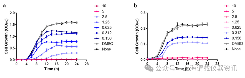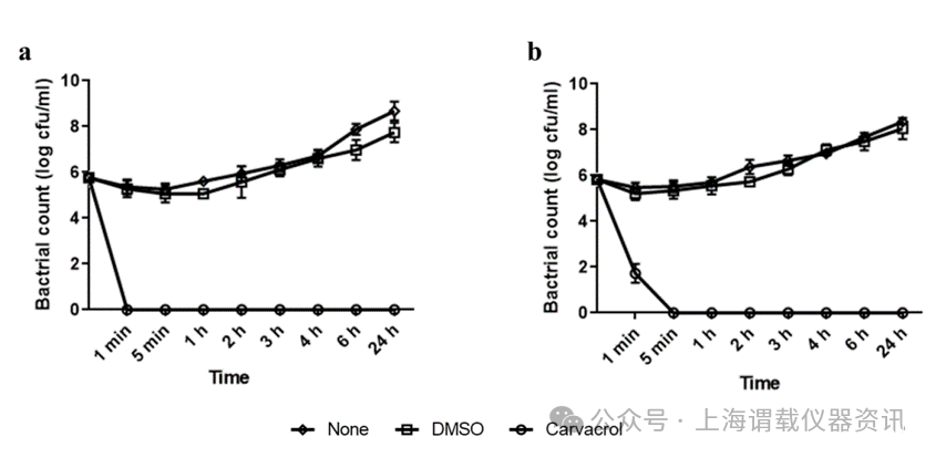 圖1、香芹酚對銅綠假單胞菌(a)(5 mg mL?1)和糞腸球菌(b)(0.625 mg mL?1)浮游細(xì)胞的最小抑制濃度(MIC)。在三個(gè)獨(dú)立實(shí)驗(yàn)中,在24小時(shí)的孵育期內(nèi),使用分光光度計(jì)以2小時(shí)的間隔在OD600 nm下使用不同濃度的香芹酚測量細(xì)菌濁度。使用含有DMSO的對照。