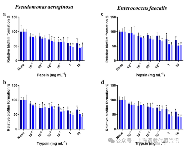 圖3、使用不同濃度(10?4–10 mg mL?1)和不同作用時(shí)間(30分鐘)的胃蛋白酶和胰蛋白酶分散已建立的銅綠假單胞菌(a,b)和糞腸球菌(c,d)生物膜。在37°C下在96孔聚苯乙烯板中研究生物膜分散。在OD600下測量總生物膜形成。結(jié)果表示為三個(gè)獨(dú)立實(shí)驗(yàn)的平均值(±SD)。*p<0.05表示與使用Tukey檢驗(yàn)的對照相比存在顯著差異。