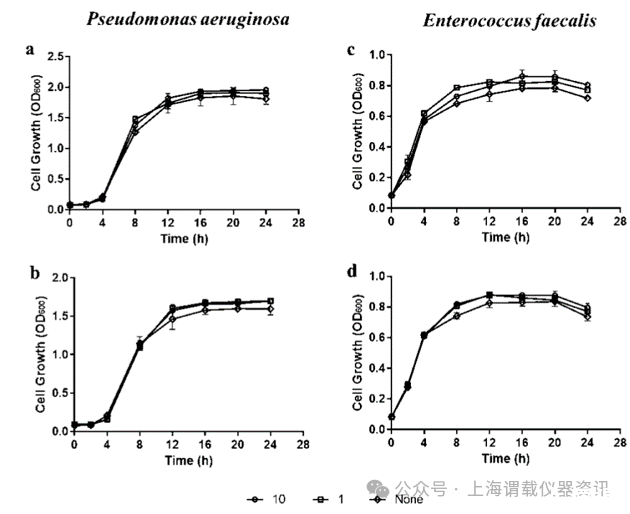 圖4、銅綠假單胞菌(a,b)和糞腸球菌(c,d)細(xì)胞在胃蛋白酶(a,d)和胰蛋白酶(b,d)存在下于37°C下培養(yǎng)24小時(shí)的生長情況顫抖。在三個(gè)獨(dú)立的實(shí)驗(yàn)中,在24小時(shí)的孵育期內(nèi),使用分光光度計(jì)以2小時(shí)的間隔在OD600 nm處用不同濃度的酶測量細(xì)菌濁度。