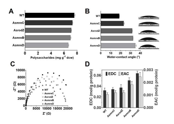 電化學(xué)阻抗譜掃描表明變寬菌株的生物膜導(dǎo)電性更強(qiáng),內(nèi)阻更低。與此同時,變寬工程菌株AsmreB和AsmreD的EDC和EAC明顯高于WT,表明工程菌株生物膜的電活性也更高。上述結(jié)果表明,胞的擴(kuò)寬不僅增強(qiáng)了基于c型細(xì)胞色素的直接EET,還有助于電活性生物膜形成的初始粘附和垂直擴(kuò)展過程。