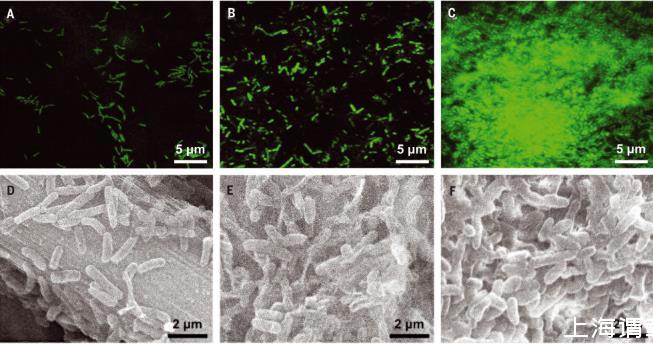 結(jié)果顯示,工程菌株的具有更高的水接觸角,其中菌株AsmreC為23.27°,菌株AsrodZ為31.80°,菌株AsmreB為32.62°,菌株AsmreD為34.98°,均高于WT的18.78°。這是因?yàn)楣こ叹甑募?xì)胞表面多糖的減少,導(dǎo)致細(xì)胞表面疏水性增強(qiáng),從而使得水接觸角的增大,這有助于生物膜形成初始階段的表面附著過程。細(xì)胞寬度的增加使細(xì)胞變得更接近于球狀,球狀細(xì)胞相對桿狀細(xì)胞更有助于生物膜的垂直擴(kuò)展,從而增加生物膜的厚度。