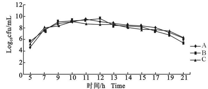 圖3副雞禽桿菌A、B、C 3個血清型參考菌株的生長曲線(活菌計數(shù)法)