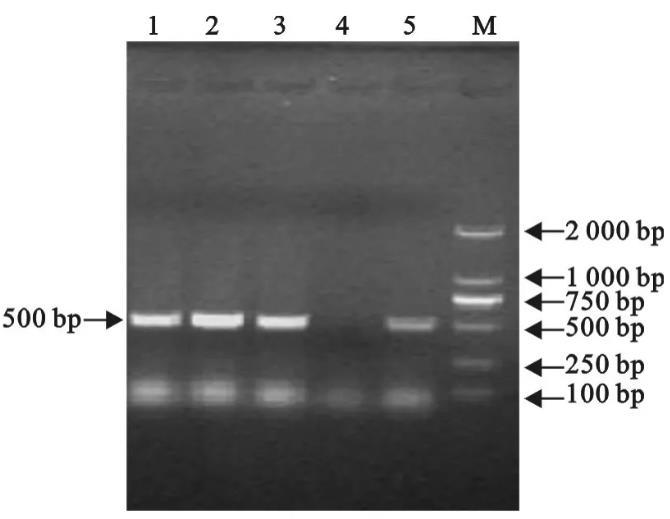 經(jīng)純檢,48 h后普通營養(yǎng)瓊脂平板表面無細菌長出,表明細菌培養(yǎng)過程中無污染;菌落PCR檢測在500 bp處出現(xiàn)了清晰的電泳條帶(圖1),表明本試驗培養(yǎng)的3個菌株皆為副雞禽桿菌。