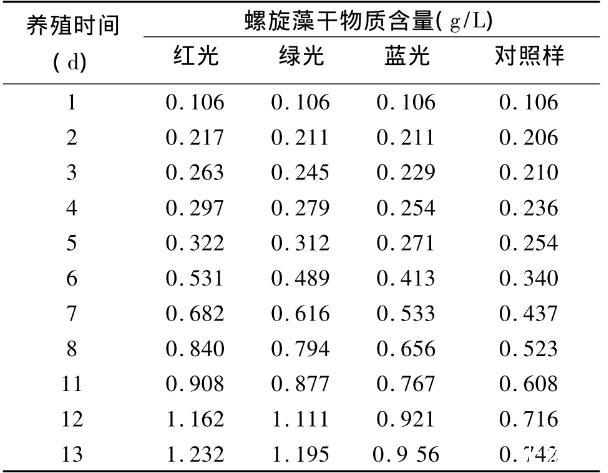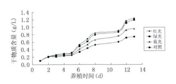 由表2數(shù)據(jù)畫圖得圖4,對照樣采用日光燈照射。從表和圖可以看出,采用紅綠藍(lán)光處理過的螺旋藻生長量明顯高于對照樣。經(jīng)過13 d養(yǎng)殖,螺旋藻干物質(zhì)含量到達(dá)最大,紅光處理的為1.232 g/L,綠色處理的為1.195 g/L,藍(lán)色處理的為0.956 g/L,對照樣的為0.742 g/L。紅光處理過的螺旋藻干物質(zhì)含量最大,比對照樣增加了66.04%。