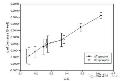 圖4、通過(guò)兩次不同接種量的黃曲霉與外源黃曲霉在不同培養(yǎng)時(shí)間下的平均生物量比較。培養(yǎng)溫度為20℃。