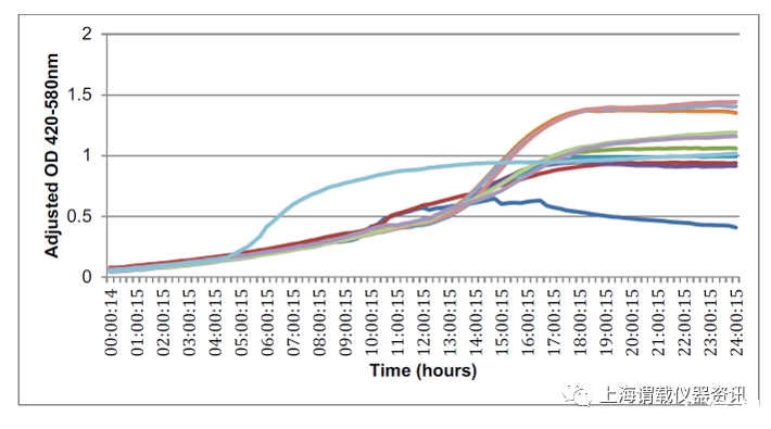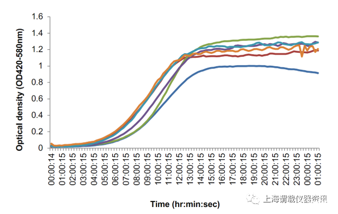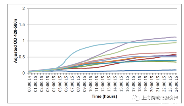 使用Bioscreen C分析儀評估了增溶劑的毒性。Bioscreen C全自動生長曲線分析儀可以用來確定有無防腐劑的細菌生長動力學。Bioscreen蜂窩板的每個孔在TSB中總共含有400μl細菌懸浮液(?2×10 6 cfu孔-1)。Bioscreen全自動生長曲線分析儀在25°C(±1°C)下運行24 h,每隔15分鐘使用寬帶濾光片(420–580 nm)讀取讀數(shù),然后搖動10 s。