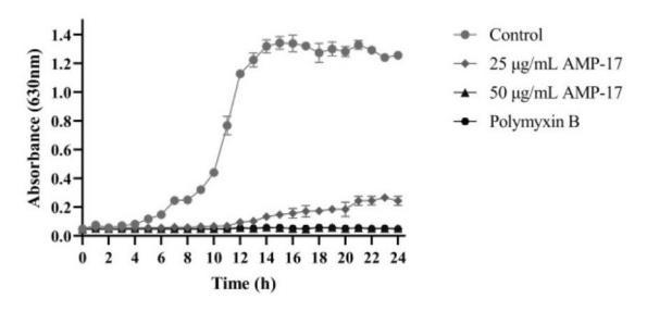 與不同濃度的AMP-17共同置于37℃孵育24小時(shí),每小時(shí)測(cè)定一次630nm處的吸光度值,記錄結(jié)果并繪制生長(zhǎng)曲線;