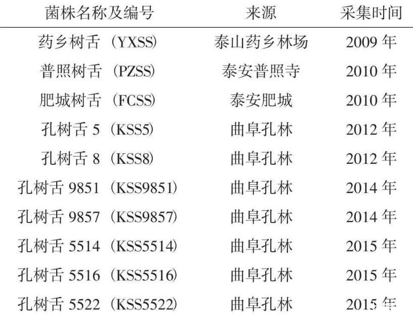 本試驗(yàn)供試菌株均為筆者從泰安及其周邊地區(qū)收集的野生樹舌靈芝子實(shí)體上分離純化后獲得,保存于泰安市農(nóng)業(yè)科學(xué)研究院食用菌研究所。來源、采集時(shí)間及編號(hào)見表1。