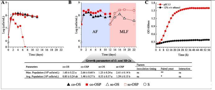 圖2、微生物的增長。(A)在AF期間釀酒酵母(實線)和發(fā)酵性絲孢酵母(虛線)。(B)在AF和MLF期間葡萄酒酒球菌SD-2a。(C)葡萄酒酒球菌SD-2a在pH 3.4和12%v/v乙醇下。